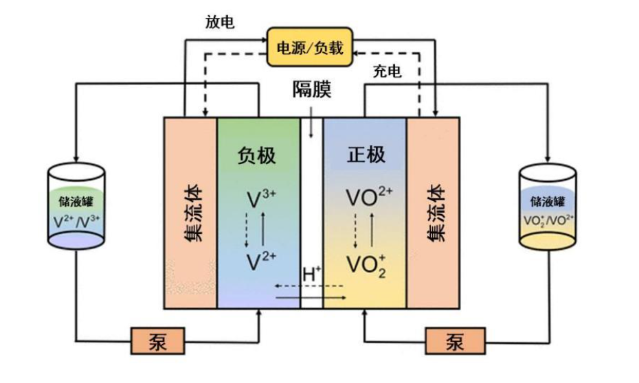 液流电池主要由正负极的两个电解液储罐和中间的电堆组成,两者成本加一起占比超60%,通过两侧溶液中的活性物质的氧化还原反应来实现充放电,通过泵将电解液输送到电堆反应室,通过活性物质如钒的高低价态变化,实现电能与化学能的转换。