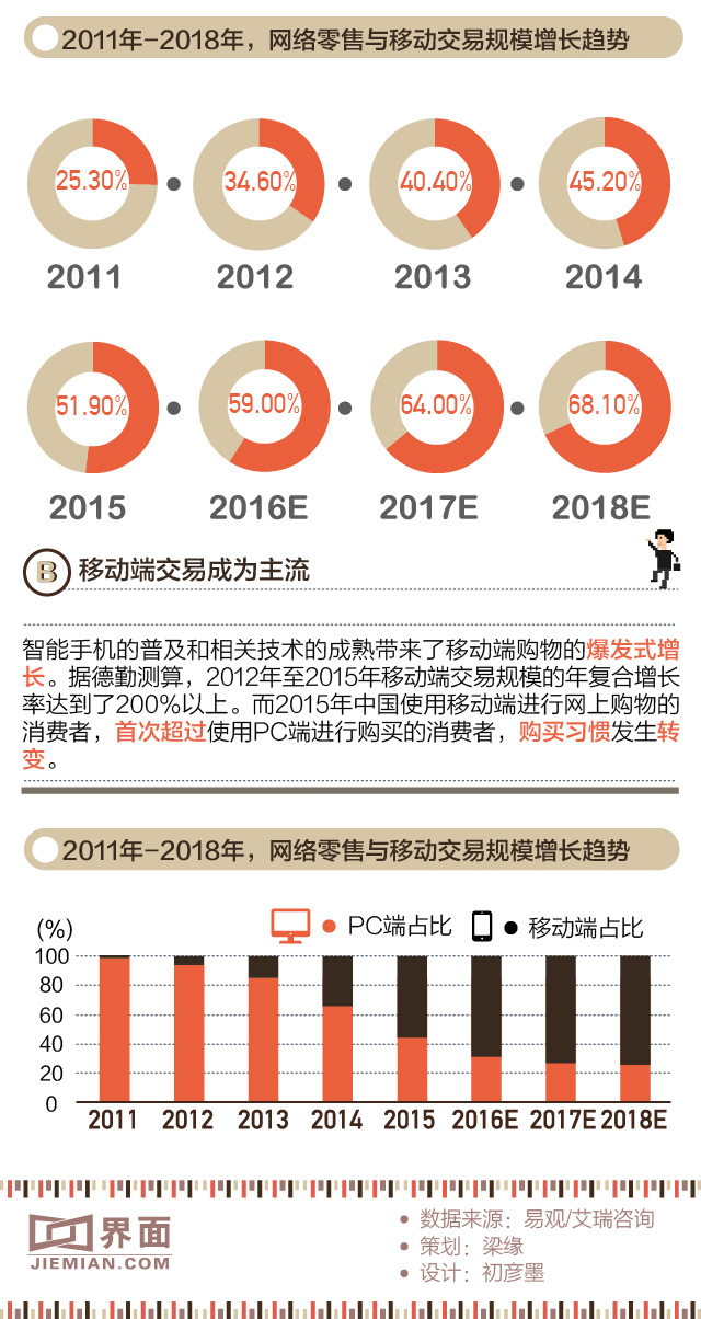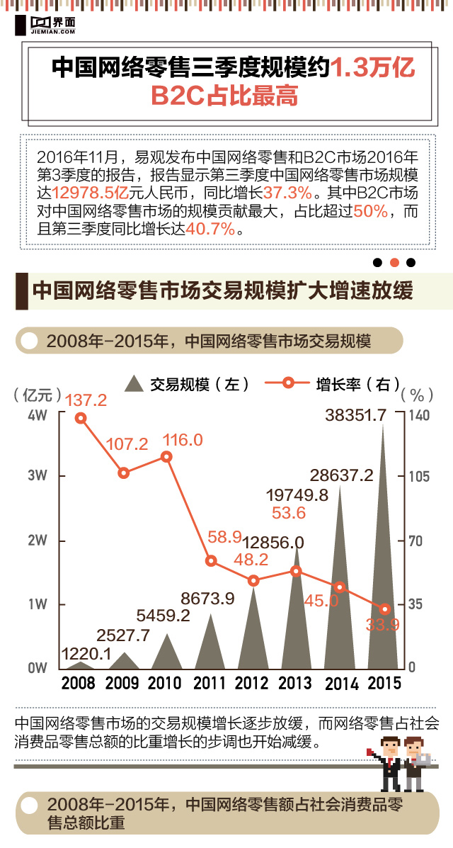 2016年11月,易观报告显示,中国网络零售第三季度市场规模12978.5亿元,同比增长37.3%,其中B2C市场贡献最高,占比超过50%。