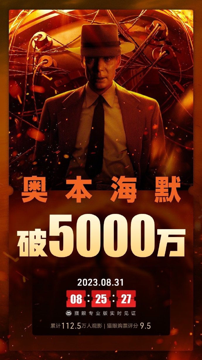 据猫眼专业版数据,电影《奥本海默》上映2天 ,总票房破5000万。
