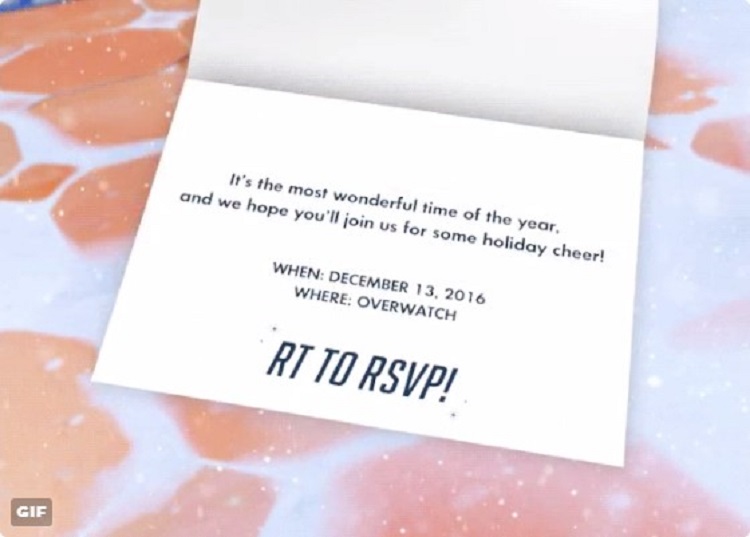 《守望先锋》团队在贺卡中表示游戏内的圣诞活动会在2016年12月13日与玩家们见面,并且在贺卡中向所有玩家发出了邀请函:“年度佳节,我们期待与你举杯共饮。”