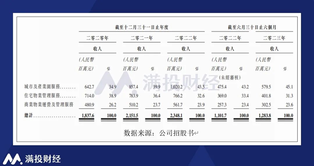 按业务划分,2020年至2022年,城市及产业园服务收入分别是6.25亿元、8.57亿元和10.2亿元,2023年前六个月的收入为5.8亿元,较2022年同期增长21.9%;同一年份区间里,商业物业联营及管理服务的收入为4.81亿元、5.1亿元和5.62亿元,2023年6月底更是达到了3.03亿元的水平。