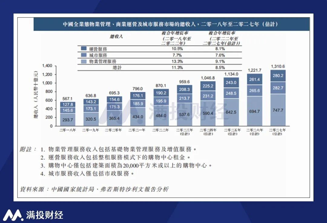从行业前景来看,中国物业服务市场在过去几年业绩实现增长,依招股书披露,根据国家统计局和弗若斯沙利文的资料显示,2018年至2022年,中国全态业务管理、商业运营及城市服务市场总收入从5671亿元增长至8701亿元,年复合增长率为11.3%。