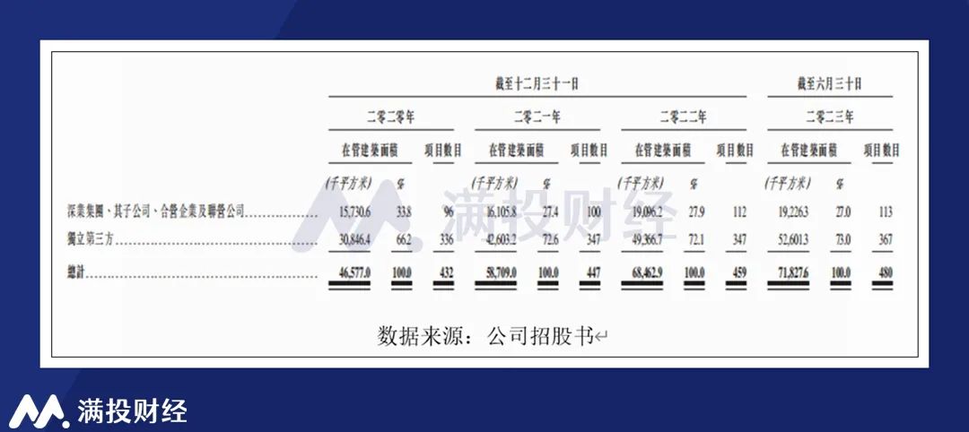 2020年至2023年6月30日,深业物业的签约建筑面积分别为47.1百万平方米、61.2百万平方米、71.9百万平方米及75.6百万平方米;同期,在管建筑的面积分别为46.6百万平方米、58.7百万平方米、68.5百万平方米及71.8百万平方米。