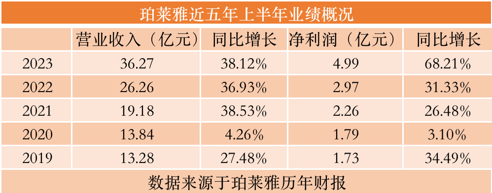 同时,这是珀莱雅近五年来净利润及其增幅最高点,增长幅度与2022年同期相比,多出近37个百分点。而从营收上来看,这也是珀莱雅上半年业绩首次突破35亿大关,比去年同期增加了10亿元营收,意味着珀莱雅登上集团发展史上又一高峰。