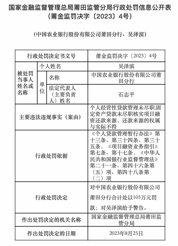8月31日,国家金融监督管理总局莆田监管分局行政处罚信息公开表显示,中国农业银行股份有限公司莆田分行被罚款105万元,主要主要违法违规事实包括:个人经营性贷款管理未尽职;固定资产贷款未尽职核实项目融资还款来源,还款来源的权属与实际不符。