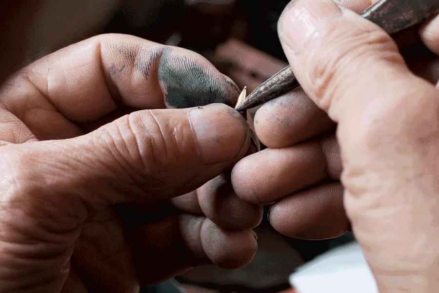 “点尖”是施天水的拿手绝活,也是修理钢笔中最高超的技术。一支笔经过多年的书写,笔尖前端的铱粒会磨秃,这时候就需要换上一颗新的铱粒。把它焊上笔尖,再亲自用锯片把铱粒一破两半,动作干净利落,丝毫不输今天的激光工艺。