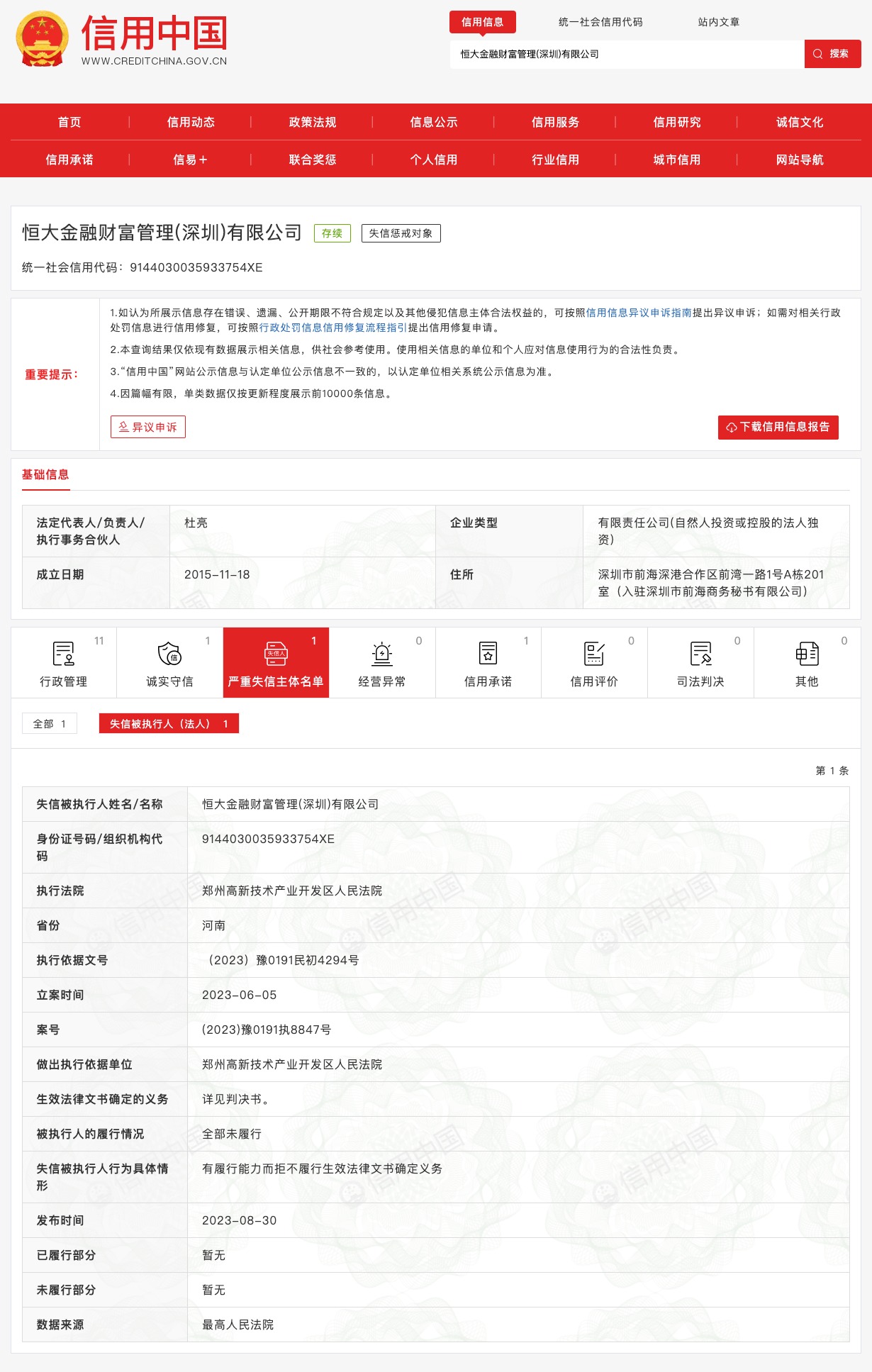 天眼查App显示,近日,因有履行能力而拒不履行生效法律文书确定义务,恒大财富关联公司恒大金融财富管理(深圳)有限公司被列为失信被执行人,涉及劳动争议案件。案件流程信息显示,今年6月,该公司因此案被强制执行5.4万余元。