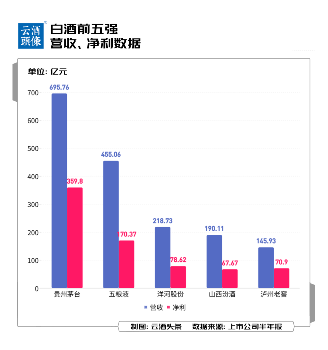 2023上半年,21家白酒上市公司共实现营收2158.84亿元,净利润845.88亿元(不含顺鑫农业),贵州茅台、五粮液、洋河股份、山西汾酒和泸州老窖共实现,其营收、净利在白酒上市公司中的占比分别为79.00%和88.35%。