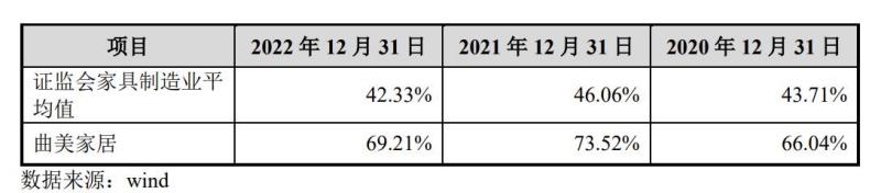 2023年6月30日,曲美家居的资产负债率为69.37%,和2022年年末的69.21%相比,没有出现下降。此前,曲美家居公告称,截至2022年年末,其资产负债率高于行业平均水平,存在一定偿债压力。2020年至2022年各年末,行业平均负债率为43.71%、46.06%和42.33%,而曲美家居的各年末负债率均明显高于行业平均值。