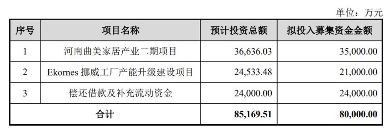 根据8月15日收盘后披露的募集说明书(申报稿),曲美家居拟发行不超过1.17亿股股票,募集的资金总额预计不超过8亿元(含本数),扣除发行及相关费用后,河南曲美家居产业二期项目预计需要3.50亿元,Ekornes挪威工厂产能升级建设项目预计需要2.10亿元,而偿还借款及补充流动资金需要2.40亿元。