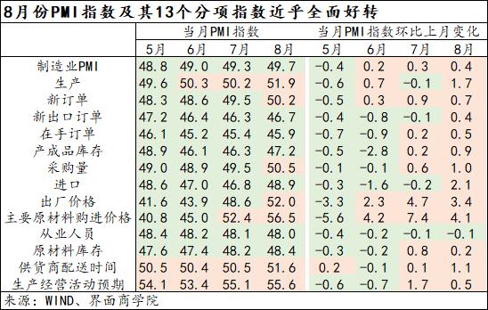 生产指数回升幅度为2006年来同期最高:8月份,制造业PMI生产指数录得51.9%,连续第三月落在扩张区间,较6月份上升1.7个百分点,变化程度为2006年以来同期最高,同期均值为0.15个百分点。2009年到2022年间生产指数8月较7月上升幅度最大值仅为0.6个百分点,2019年-2022年间,仅2022年8月持平于7月,其他三年8月较7月都在下降。