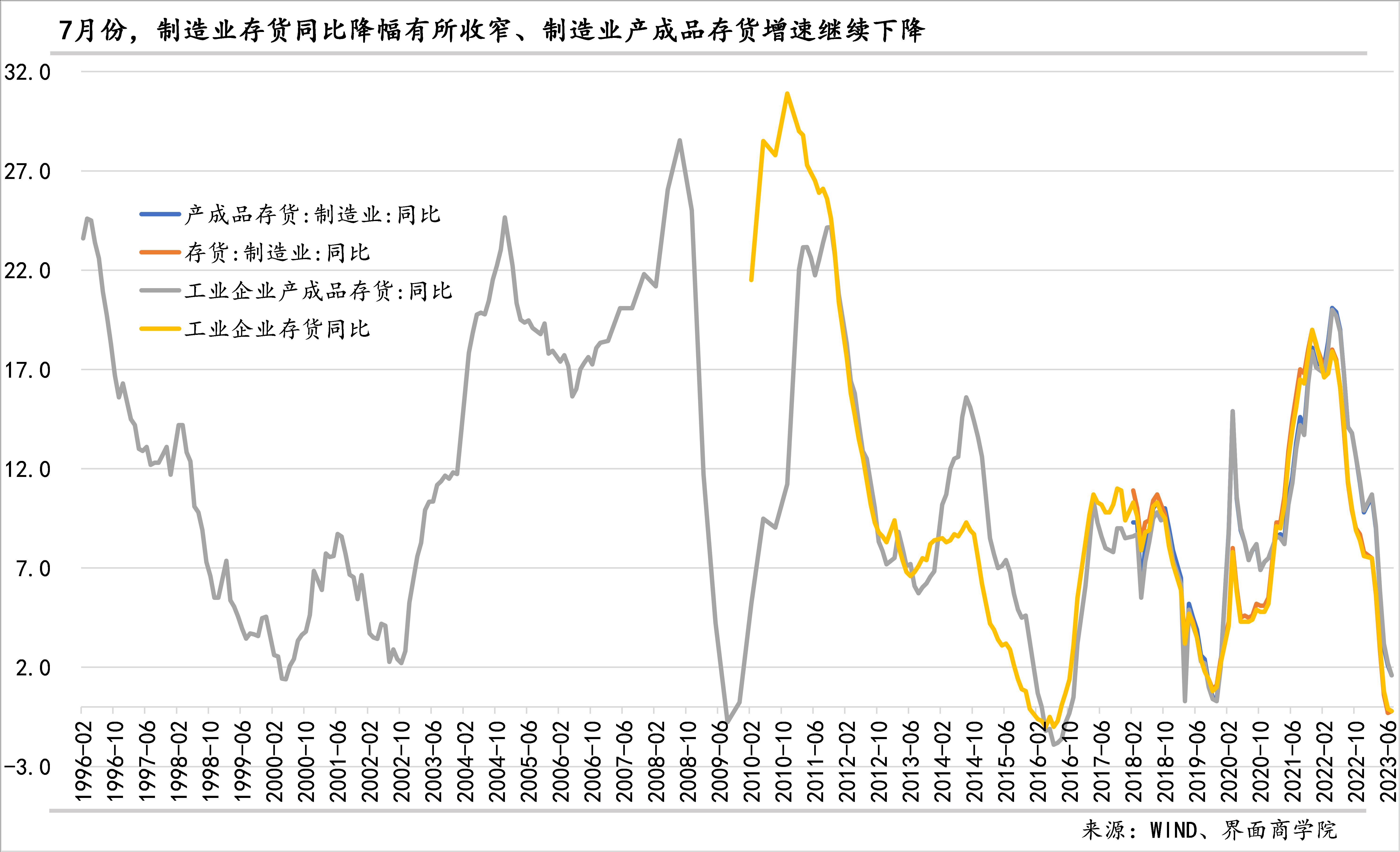 7月份,制造业存货同比下降0.2%,较6月份上升0.1个百分点,这是其月度环比变化自2022年5月以来首次由负转正;制造业产成品存货同比增速继续下降,7月下降0.5个百分点至1.6%。由于制造业库存变化与工业企业库存变化基本一致,我们可以参考后者在更长时期内的变化,后者周期性特征明显,目前,工业企业存货增速已低于2019年、略高于2016年,产成品存货增速仍高于过去几轮周期底部。
