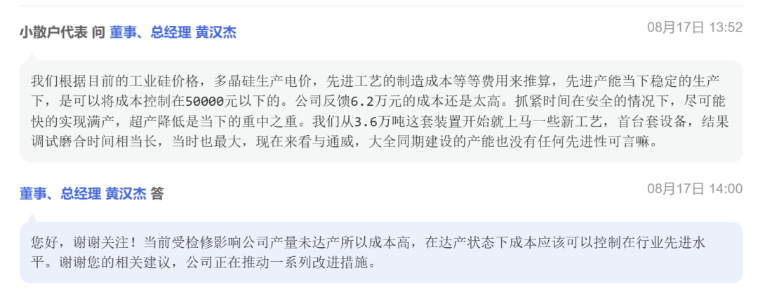 但是在上证路演中心的投资者交流活动中,有投资者提出6.2万元/吨的成本时,特变电工总经理黄汉杰并未否认与澄清,只是简单回复:“现在未达产所以成本高,未来成本将控制在行业先进水平。”不知道他所指的行业先进水平的标准是什么。