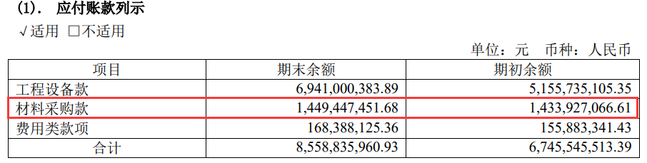 在公司披露的应付账款信息中,材料采购款一项为14.49亿,比期初余额变化并不明显。而2022年同期,该笔款项同样为14.34亿元。