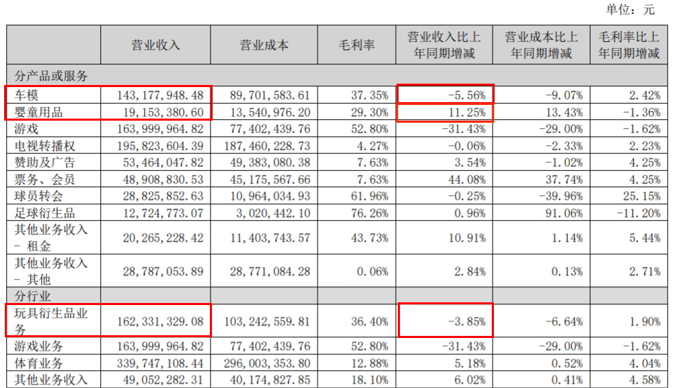 报告期内,“玩具及相关业务营业收入”为9585.16元(玩具制造业收入7181.33万元,同比减少21.78%;批发和零售收入2403.83万元,同比减少10.17%),同比下滑19.16%,在公司营业总收入中占比85.41%。