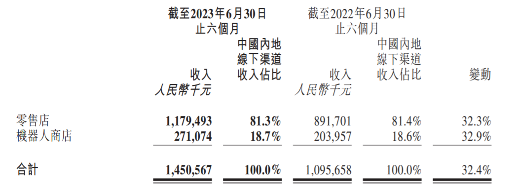 截至2022年6月30日,内地(大陆)零售店增至340家,销售收入同比增长了32.3%至11.80亿元;机器人商店合计2185间,销售收入同比增长了32.9%至2.71亿元。
