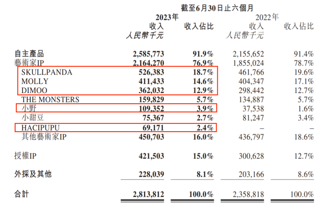 按IP划分,2023年上半年,艺术家IP(包括自有IP和独家IP)收入18.55亿元,SKULLPANDA贡献最多营收,MOLLY和DIMOO次之,这三大IP共占了总收入的46.2%,分别实现收入5.26亿元、4.11亿元、3.62亿元。