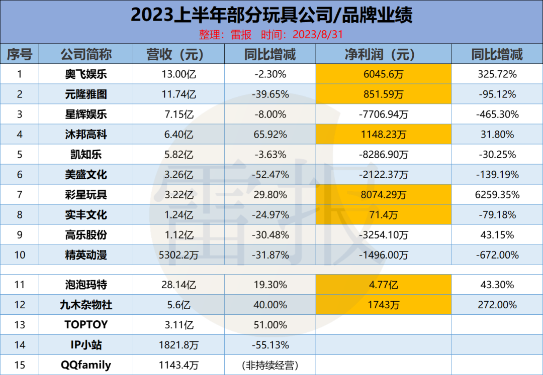近期,各大上市玩具公司相继公布了2023年上半年业绩。雷报【微信:leinewspaper +关注】统计了15家玩具公司/品牌(包含潮玩)的上半年收入情况: