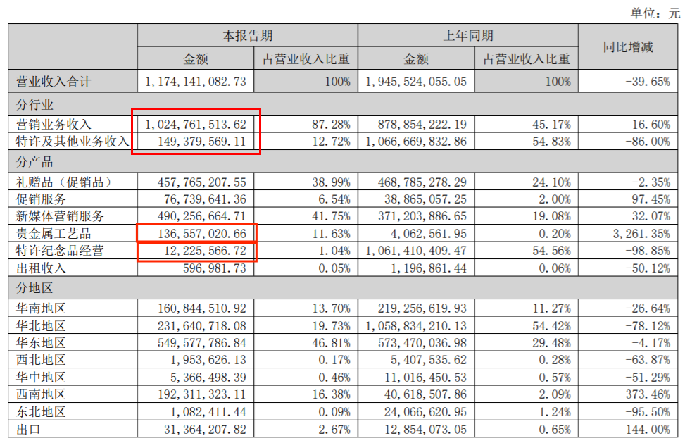 分行业看,2023年上半年,“营销业务板块”(包括礼赠品、促销服务和新媒体营销)共实现收入 10.25 亿元,同比增长16.60%;“特许及其他业务板块”收入1.49亿元,同比减少86%。
