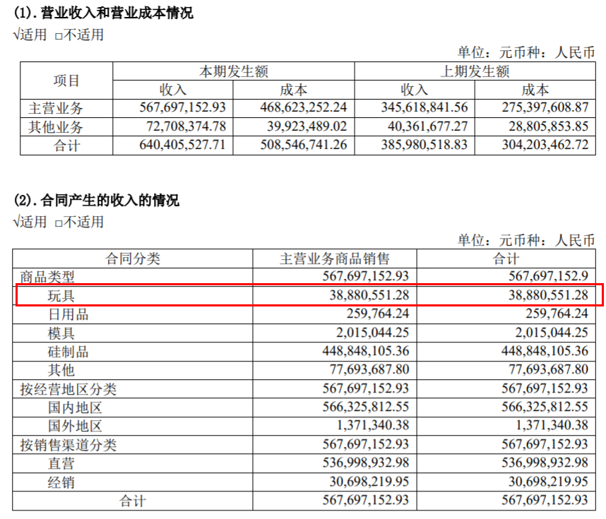 分产品来看,“玩具销售”实现营收5.18亿元,占总营业收入的比重为39.83%,营业收入比上年同期增长9.07%,毛利率则达到42.47%,同比增长7.91%。