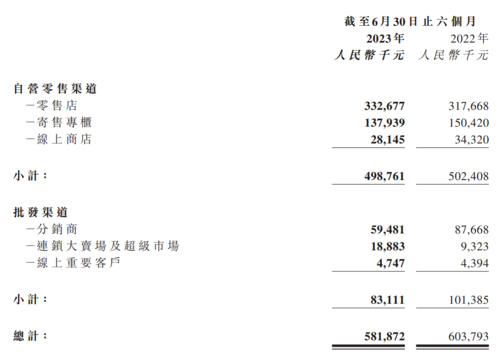 批发渠道中,截至2022年6月30日,分销商数量为34家(去年同期515家);与12家连锁大卖场及超级市场订有批发安排;线上重要客户2家,去年同期为6家。