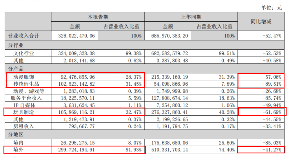 值得注意的是“传统衍生品”,上半年营收同比增长89.51%达到了1.03亿元,占总营收的31.45%,已接近最大头的“玩具制造”,去年同期该项收入占比则仅为7.89%。