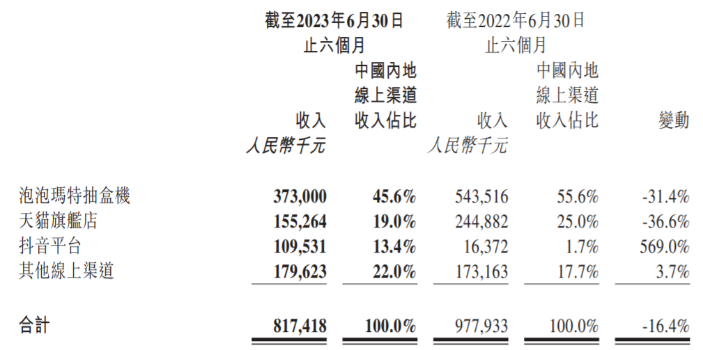 内地(大陆)线上渠道收入8.17亿元,同比下降16.4%。泡泡玛特抽盒机上半年收入3.73亿元,同比下降了31.4%;天猫旗舰店收入1.55亿元,下降了36.6%;抖音平台收入约1.10亿元,同比大幅增长569%;其他线上渠道收入则约为1.80亿元,同比增加3.7%。