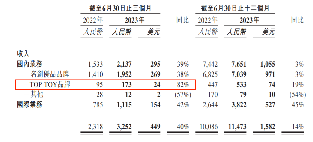 根据名创优品最新财报数据,今年二季度,TOP TOY实现收入1.73亿元,同比增长82%;第一季度收入为1.38亿元。因此,2023年上半年,旗下潮玩品牌TOP TOY总营收3.11亿,同比增长51%。