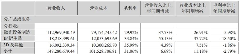 金运激光半年报显示,旗下IP衍生品业务(IP小站)实现收入1821.8万元,同比减少55.13%;毛利率为33.84%,同比减少18.50%。