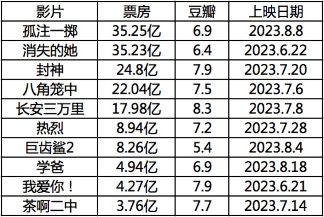 后面三部则是更兼顾品质。《封神》、《八角笼中》、《长安三万里》各具特色和优势,且三部无一例外都是凭借口碑的优势,完成了强势的逆袭,拿到了长线的表现。目前《封神》、《八角笼中》均拿到了20亿+的级别,表现堪称炸裂。而作为动画电影的《长安三万里》豆瓣达到暑期档最高的8.3分,近20亿的体量让它成为了内地动画历史第二。
