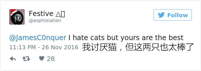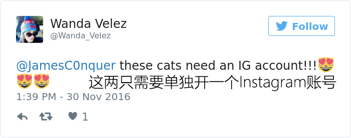 “它们俩自从被领养后就一直形影不离,什么事都要一块做,” Louie和Luna的主人James告诉Buzzfeed网站,“它们一起睡觉,一同吃饭,一块破坏我的圣诞树。”