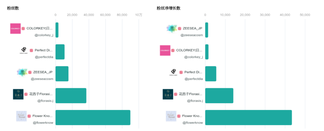 在Instagram平台,花知晓、花西子、滋色是日本市场粉丝数TOP3的国产美妆品牌,完美日记、colorkey则在近一年内显现出不错的粉丝增长趋势。