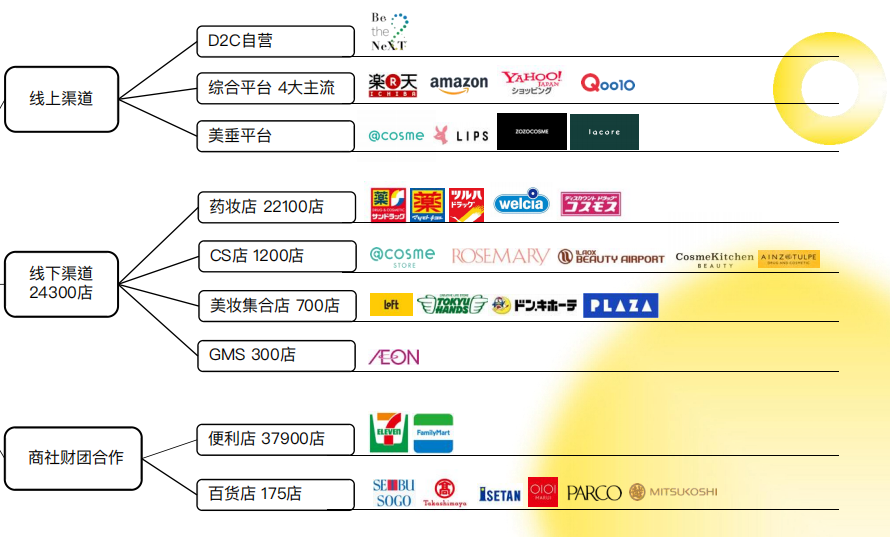 单论美妆消费,日本线上渠道主要分为品牌独立站、综合电商平台(乐天、亚马逊等)以及美妆垂类电商(@cosme、LIPS等)。日本化妆品产业的线下渠道具有多样性,分为药妆/百货店/美妆集合店/CS/GMS 等。