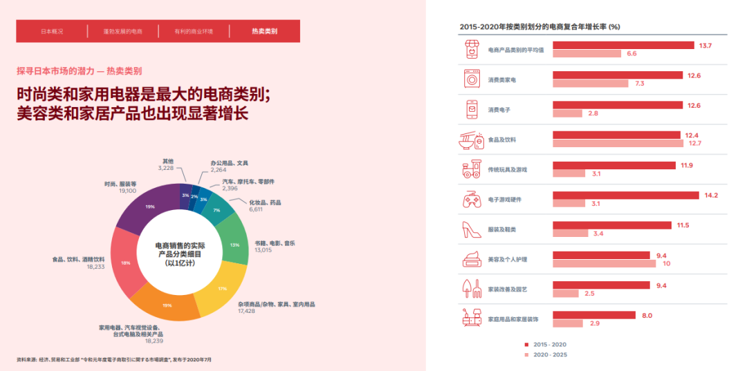 根据Facebook与Kantar在2021年发布的《制胜日本电商市场白皮书》,从2015年到2020年,日本市场美妆和个护电商复合年增长率达9.4%,位列倒数第三位,而从2020-2025年,美妆和个护电商复合年增长率预计将达到10%,从倒数第三跃升到第二,也可预见美妆品类在日本电商市场具有机会。