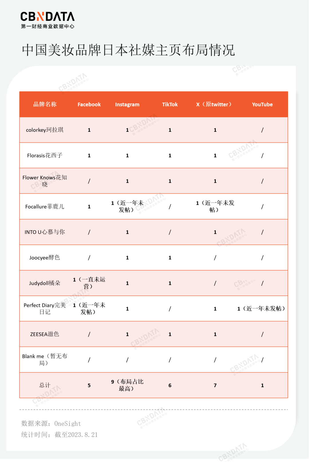 国内品牌驾轻就熟的社交媒体营销、达人种草等方式也是品牌出海的重要营销手段。出海品牌数据营销技术服务商OneSight观察到,中国美妆品牌在日本社媒的布局主要集中在Instagram、Twitter、TikTok三大平台,其中Instagram几乎是品牌首选平台。
