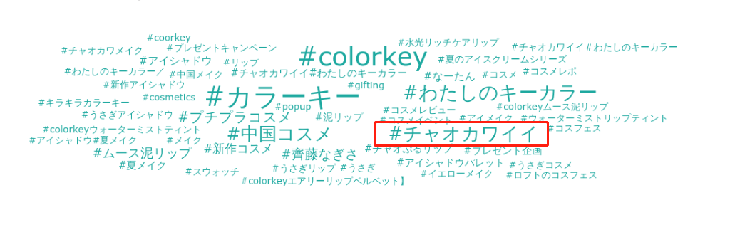 OneSight营销云后台监测数据显示,过去一年,colorkey的日本官方Instagram上,#チャオカワイイ# (超卡哇伊)是除了品牌名之外提及频次最高的话题词,超过一半的贴文带上了该话题。