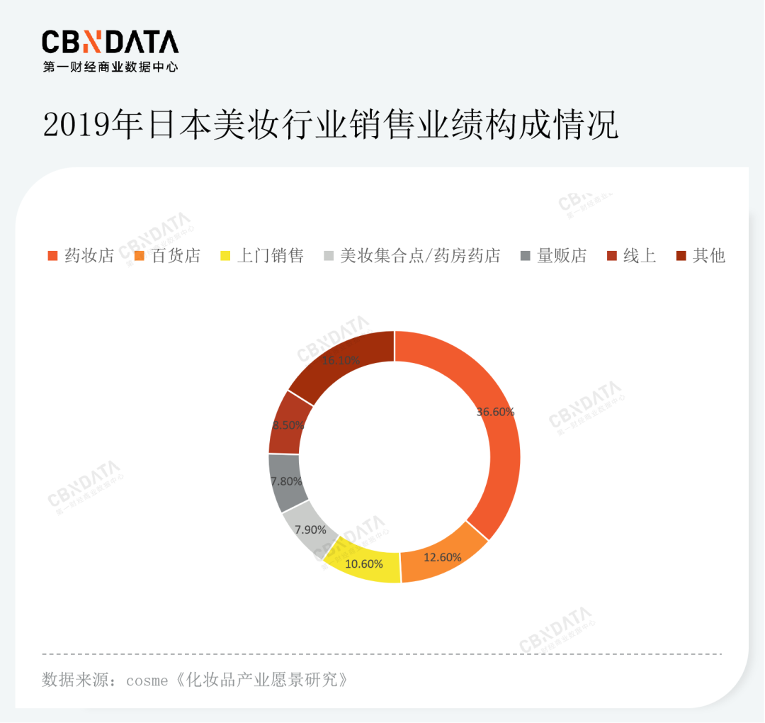 从2019 年各渠道销售业绩来看,药妆店是美妆销售最高的渠道,其次是百货店(12.6%)、上门销售(类似国内地推形式)(10.6%)、线上销售(包含品牌独立站和第三方电商平台)(8.5%)、美妆集合店/药房药店(7.9%)、量贩店(7.8%),线下仍然是日本美妆消费的主流渠道。