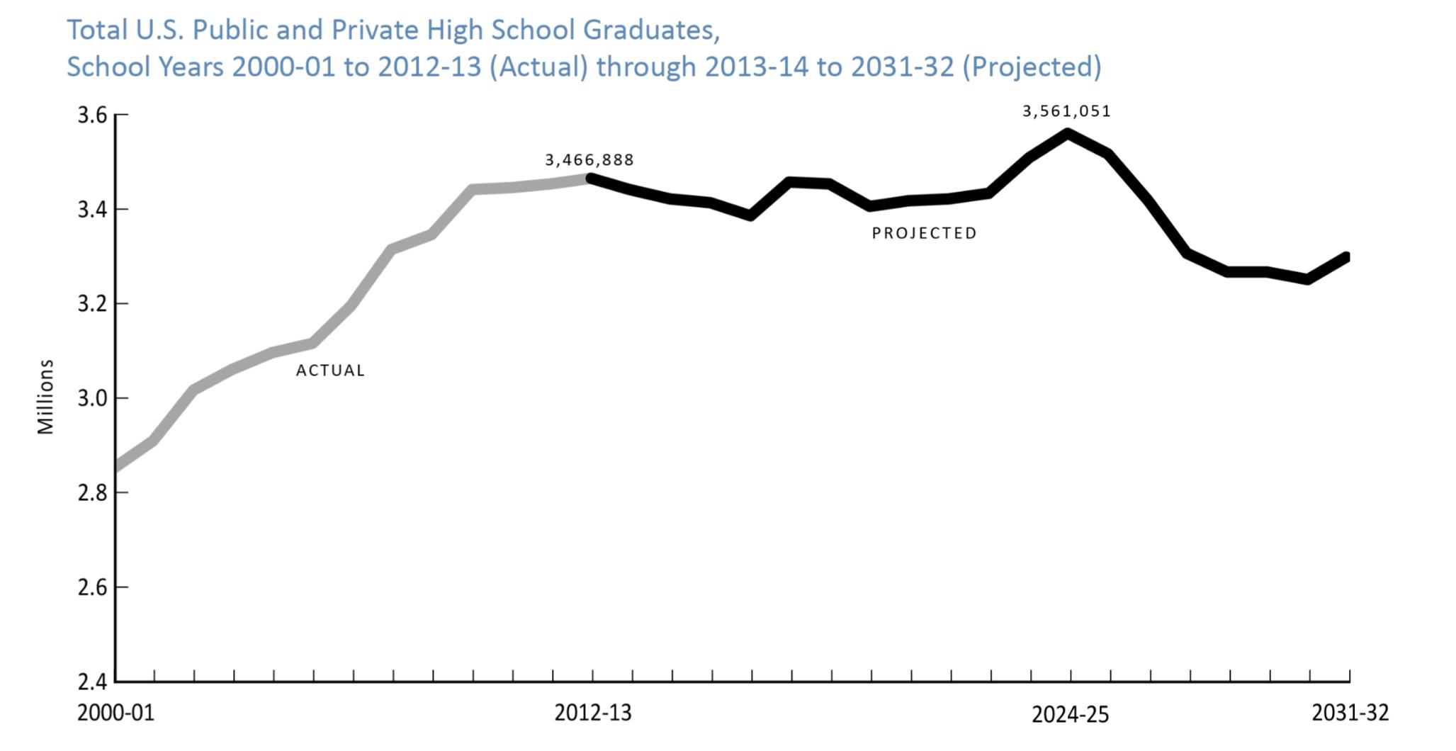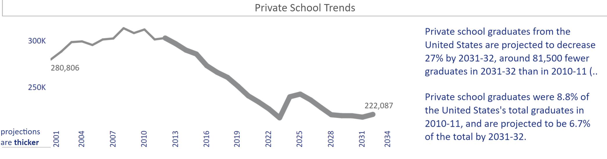WICHE还预测美国私立高中毕业生人数将大幅下降。2011年,私立高中毕业生人数为30万人,预计到2030年代,私立高中毕业生人数为22万人,降幅达26%。