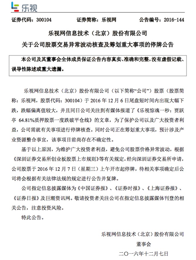12月7日,深陷舆论漩涡的乐视网紧急停牌,并于晚间发布了公告。