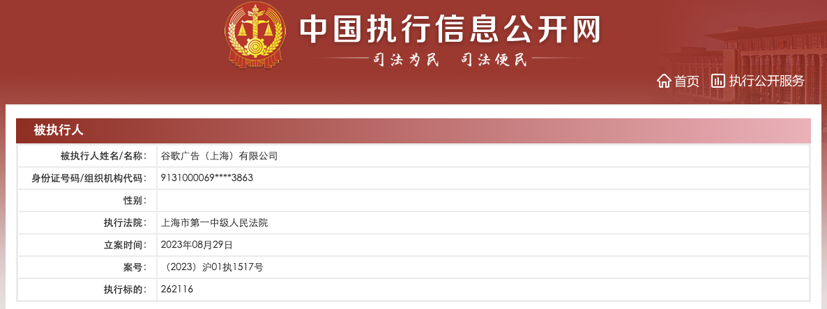 中国执行信息公开网显示,8月29日,谷歌广告(上海)有限公司新增一则被执行人信息,执行标的26万余元,执行法院为上海市第一中级人民法院。该公司成立于2009年7月,法定代表人为SCOTT DAMON BEAUMONT,注册资本100万美元,经营范围含设计、制作、发布、代理国内外各类广告及相关信息咨询服务,广告软件的开发、设计、制作等,由GOOGLE IRELAND HOLDINGS UNLIMITED COMPANY全资持股。