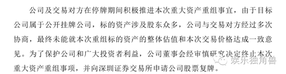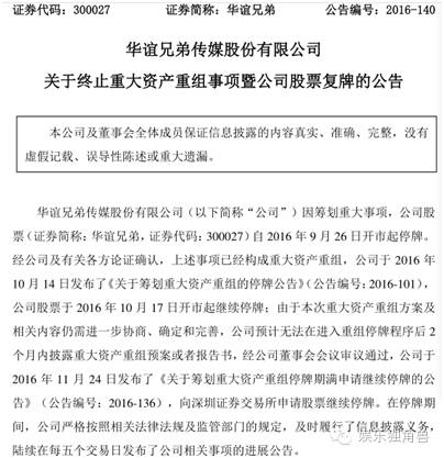 12月6日晚,华谊兄弟发布公告,称公司原拟以发行股份的方式收购新三板挂牌公司英雄互娱部分股份,由于目标公司属于公开挂牌公司,资产涉及股东众多,经多次协商最终未能就交易价格达成一致意见。华谊兄弟为了保护公司和广大投资者利益,公司董事会经审慎研究决定终止本次重大资产重组事项,并向深圳证券交易所申请公司股票于12月7日复牌。