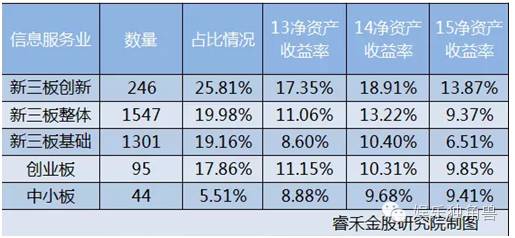 据睿禾金股研究院的数据显示,2015年,创新层、新三板(整体)、基础层、创业板、中小板信息服务业企业的净资产收益率为13.87%、9.37%、6.51%、9.85%、9.41%。、新三板整体上处于较高水平。