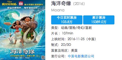 然而与北美的火热情况形成鲜明对比的,却是国内略显尴尬的票房,目前《海洋奇缘》在国内的票房仅1.5亿,而同日上映的《神奇动物在哪里》已经收获5亿。