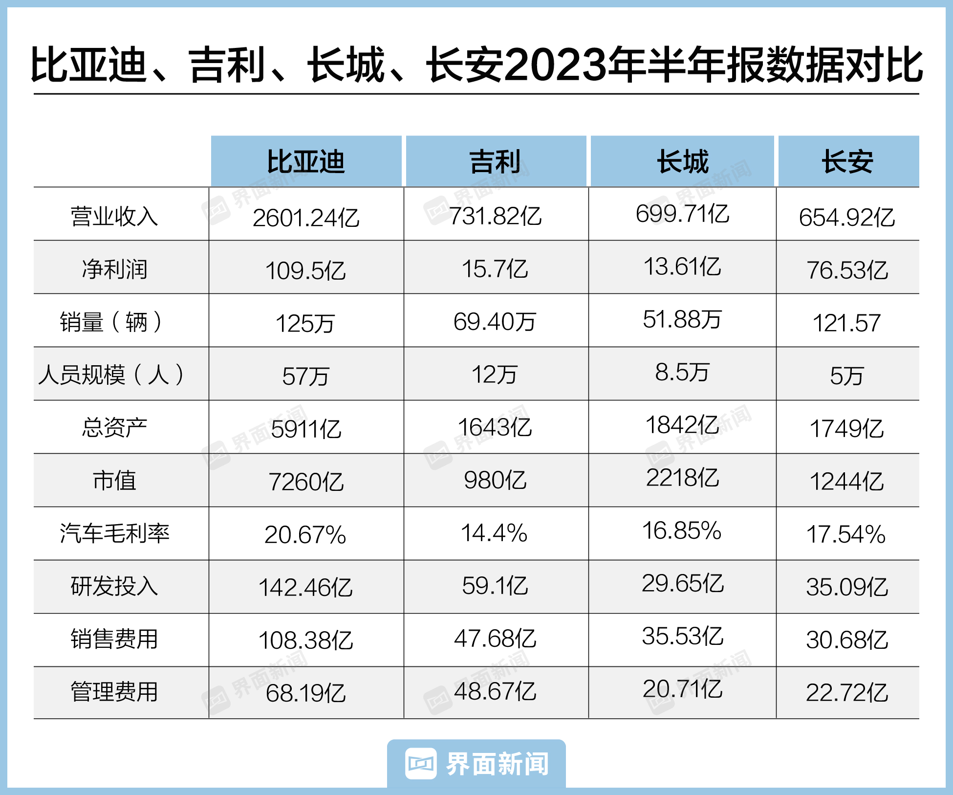 在营业收入层面,比亚迪上半年的营收已经超过了吉利、长城和长安三家品牌的总和。