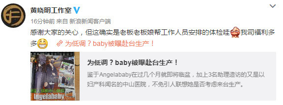 对此,黄晓明工作室随后转发新闻否认,并更新微博称,“感谢大家的关心,但这确实是老板老板娘帮工作人员安排的体检哇,我司福利多多。”