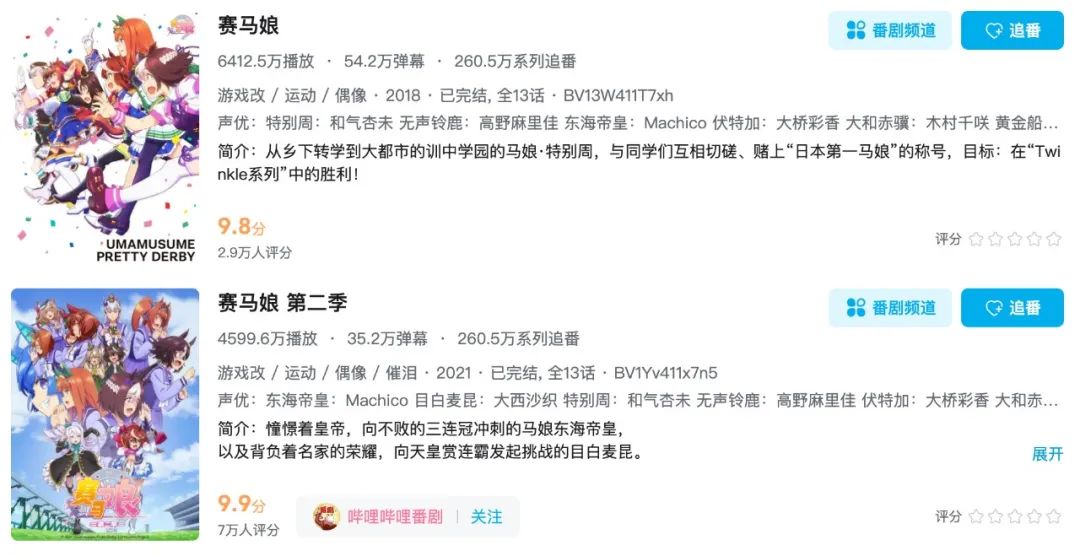 然而相比于《鬼灭之刃》《咒术回战》和《间谍过家家》在B站上动辄几亿的播放量,千万级的追番人数。《赛马娘》第一季到目前累积的播放量也仅仅只有6400多万,第二季则更是下滑到4500万,两季动画的追番人数始终稳定在了250万,算是与《赛马娘》手游的预约人数产生微妙的对应。