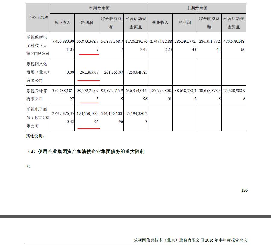 以2016年1-6月为例,乐视网旗下非全资子公司乐视致新电子科技(天津)有限公司、乐视网文化发展(北京)有限公司、乐视云计算有限公司和乐视电子商务(北京)有限公司,净利润分别约为-5687万、-26万、-9857万和-1.94亿元,“清一色”处于亏损状态。