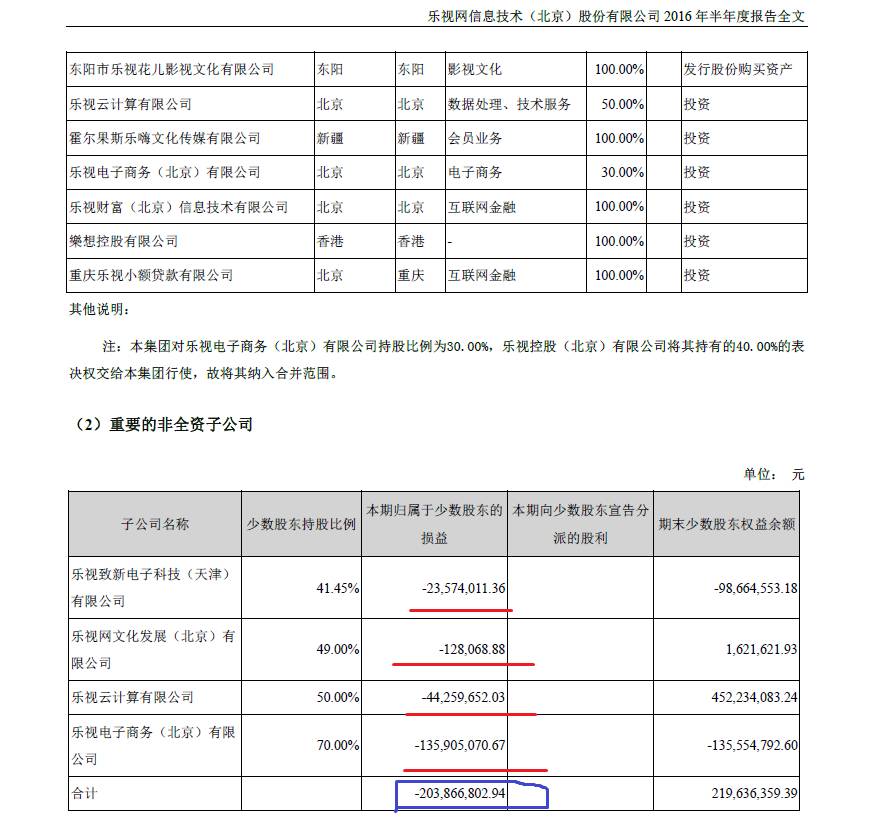 数据显示。2016年上半年,乐视致新电子科技(天津)有限公司、乐视网文化发展(北京)有限公司、乐视云计算有限公司和乐视电子商务(北京)有限公司归属于少数股东损益分别约为-2357万、-12.8万、-4426万和-1.36亿元,合计约为-2.04亿元。