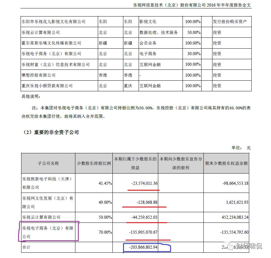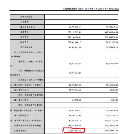 巧了。2016年上半年,乐视网少数股东损益正好约为-2.04亿元。到这里,五谷君就找到乐视网少数股东损益亏损的原因以及来源了。