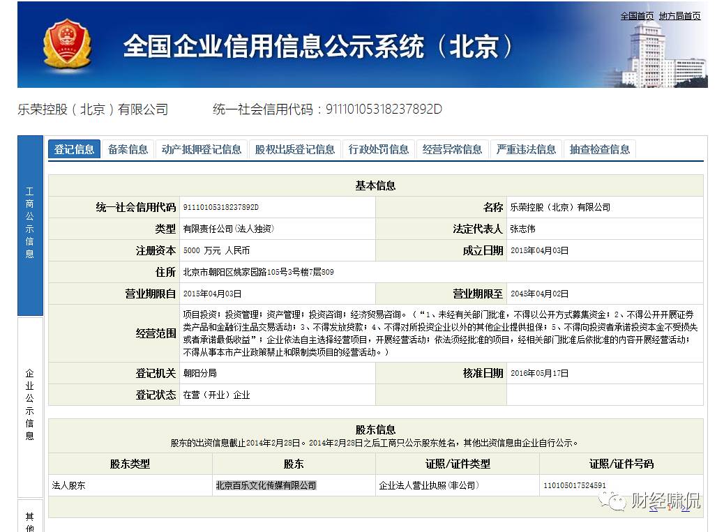 乐荣控股(北京)有限公司注册资本5000万元,只有一位法人股东,即北京百乐文化传媒有限公司。